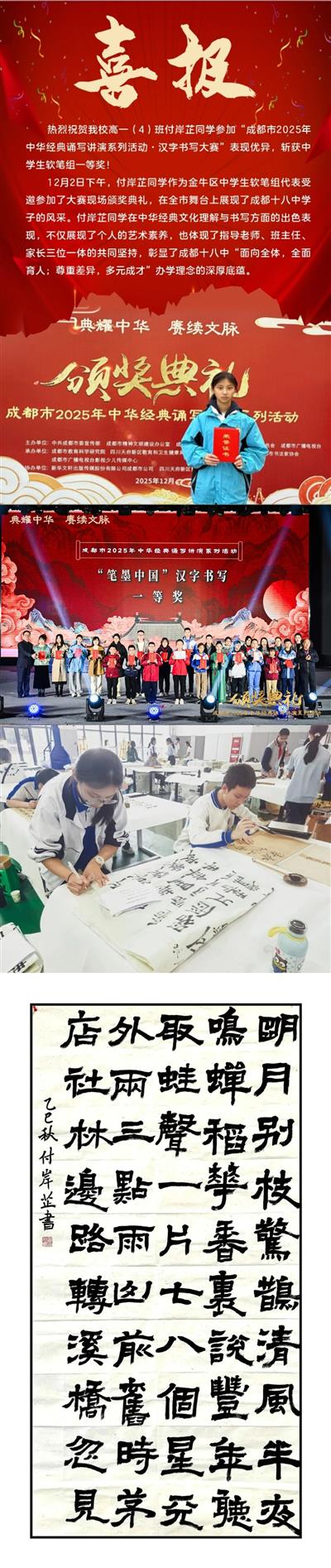 喜报!高一(4)班付岸芷斩获成都市中华经典诵写讲演系列活动·汉字书写大赛一等奖!