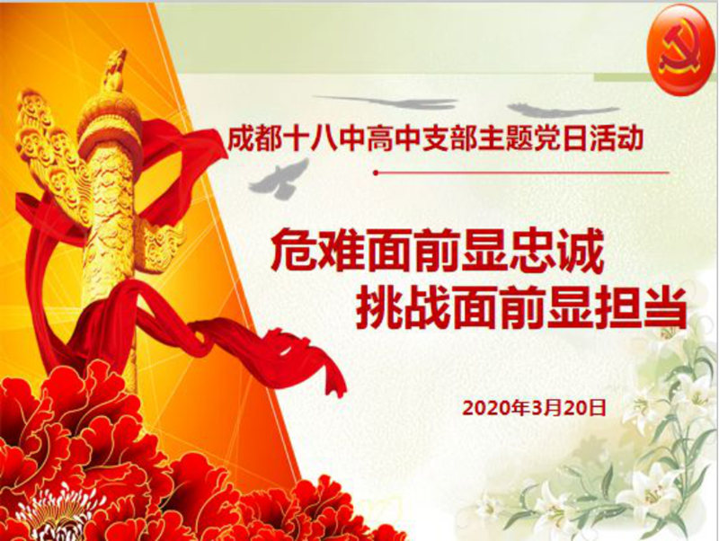 为进一步贯彻中央、省委、市委和区党委对新冠肺炎疫情防控工作的系列指示精神,推进支部党员立足岗位投身疫情防控一线,践行初心使命,3月20日上午,我校高中支部开展了“危难面前显忠诚、挑战面前显担当”的主题党日活动。