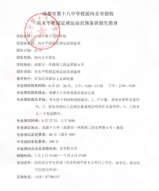 成都市第十八中学校面向全市招收高水平校园足球预备班招生简章