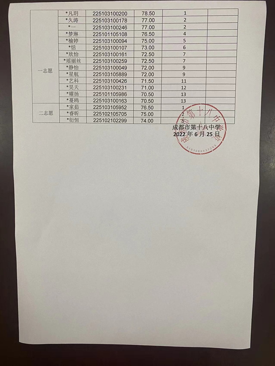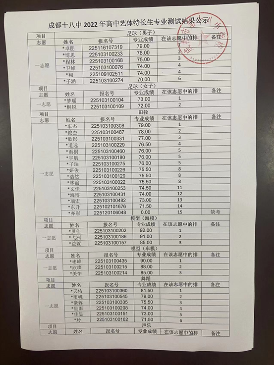 成都十八中2022年高中艺体特长生专业测试结果公示