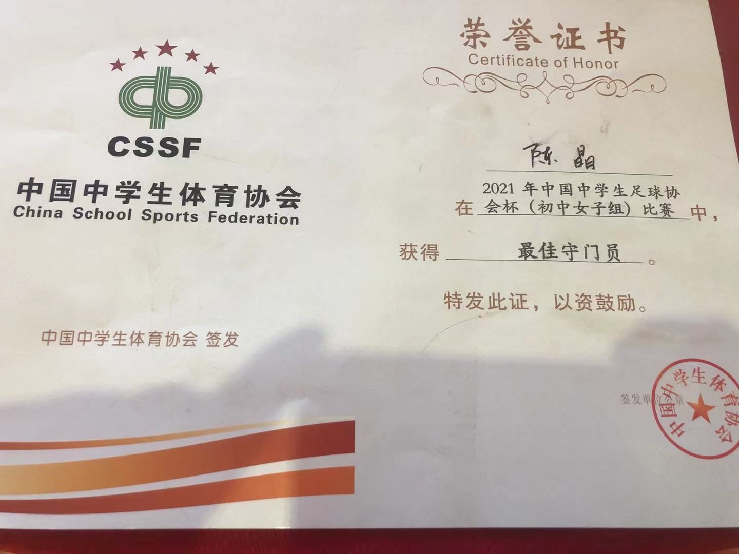 本次比赛,全国共有14支省级优秀代表队参赛。我校初中女足代表四川省中学生参加,以六战五胜一负获得第五名,孙建伟被评为全国优秀教练员,陈晶被评为全国最佳守门员,并进入中国中学生十一人最佳阵容,今后将代表中国出征比赛,另外还有三名队员作为十一人最佳阵容备选名单。