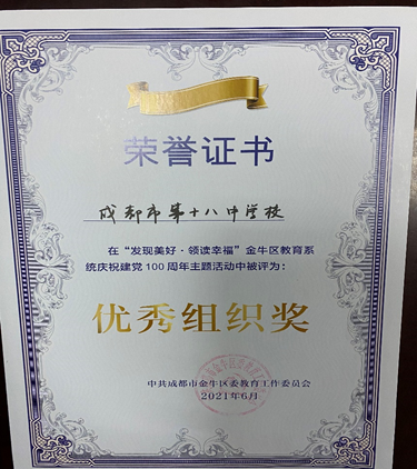 我校在2021年“发现美好领读幸福”金牛区教育系统庆祝100周年主题活动中被评为“优秀组织奖”。