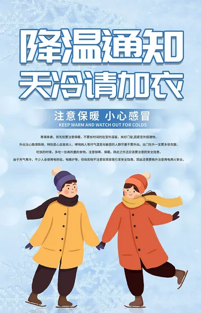 市气象台发布预警:2月20日晚上至24日,我市有一次强降温天气过程,提醒全体师生家长关注天气状况和可能导致的交通临时管制情况,合理安排返程、平安回城返校;同时,注意防范降温可能引发的电器火灾、一氧化碳中毒和大风天气悬挂物坠落等次生安全事故。