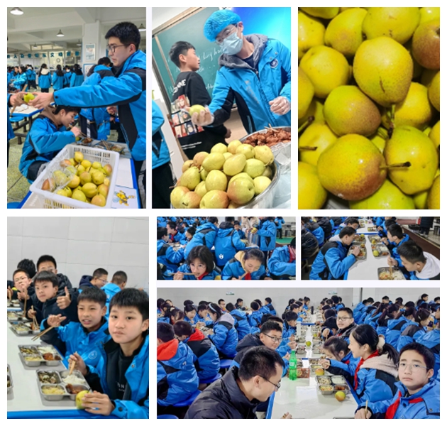 学校今天中午为全校师生准备了香梨和鸡腿,寓意不离不弃。小寒不觉寒,学校送温暖!