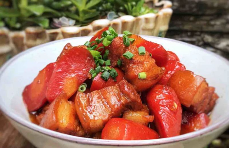 晚餐:胡萝卜烧肉、芹菜肉丝、酸辣粉条、平菇豆芽汤