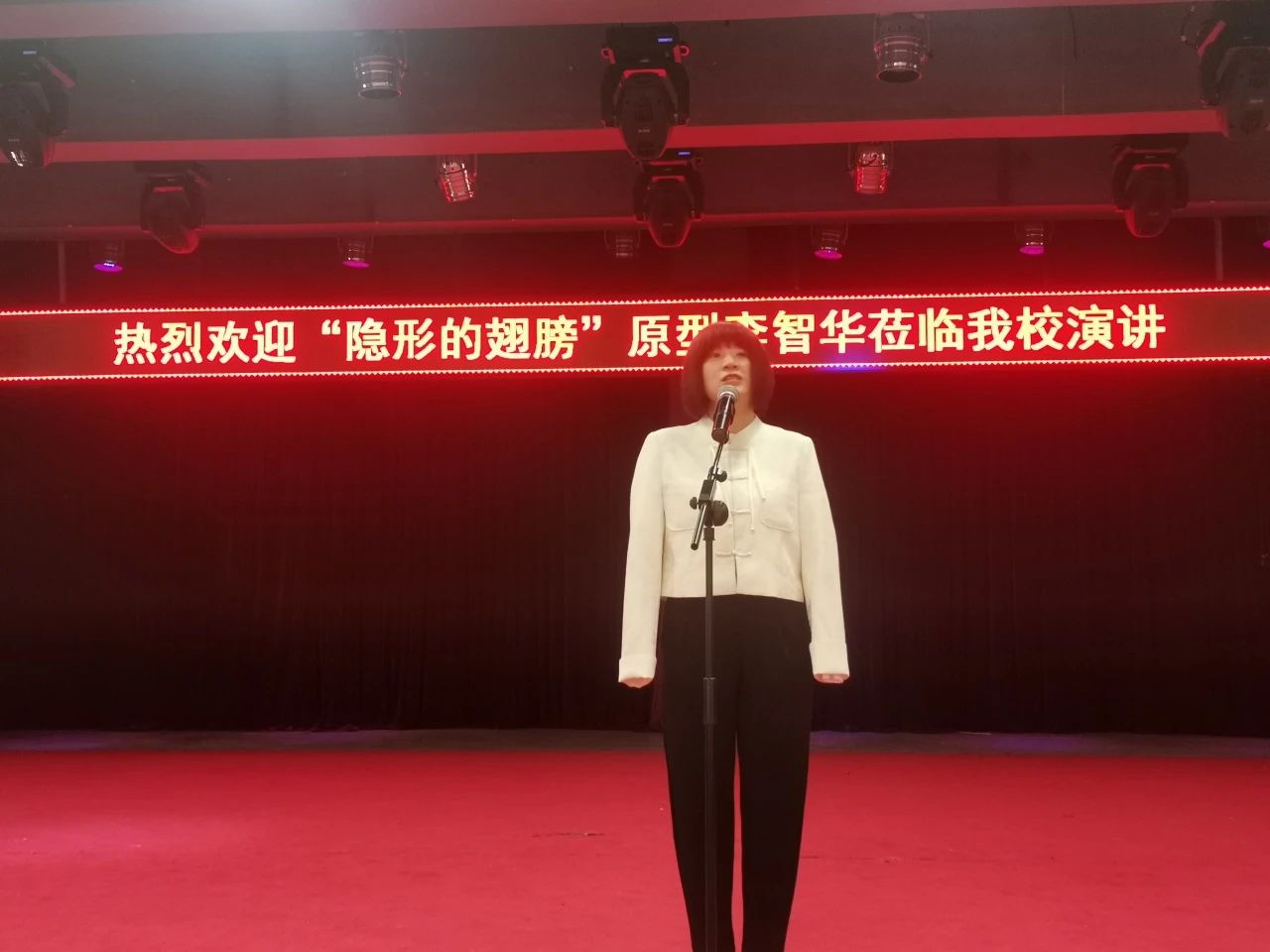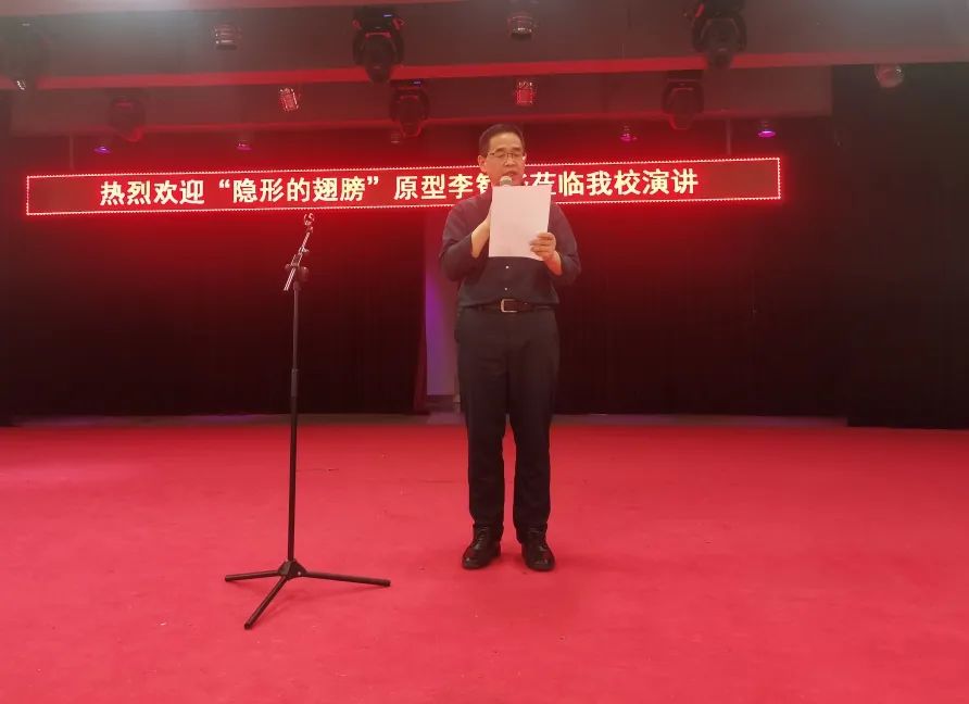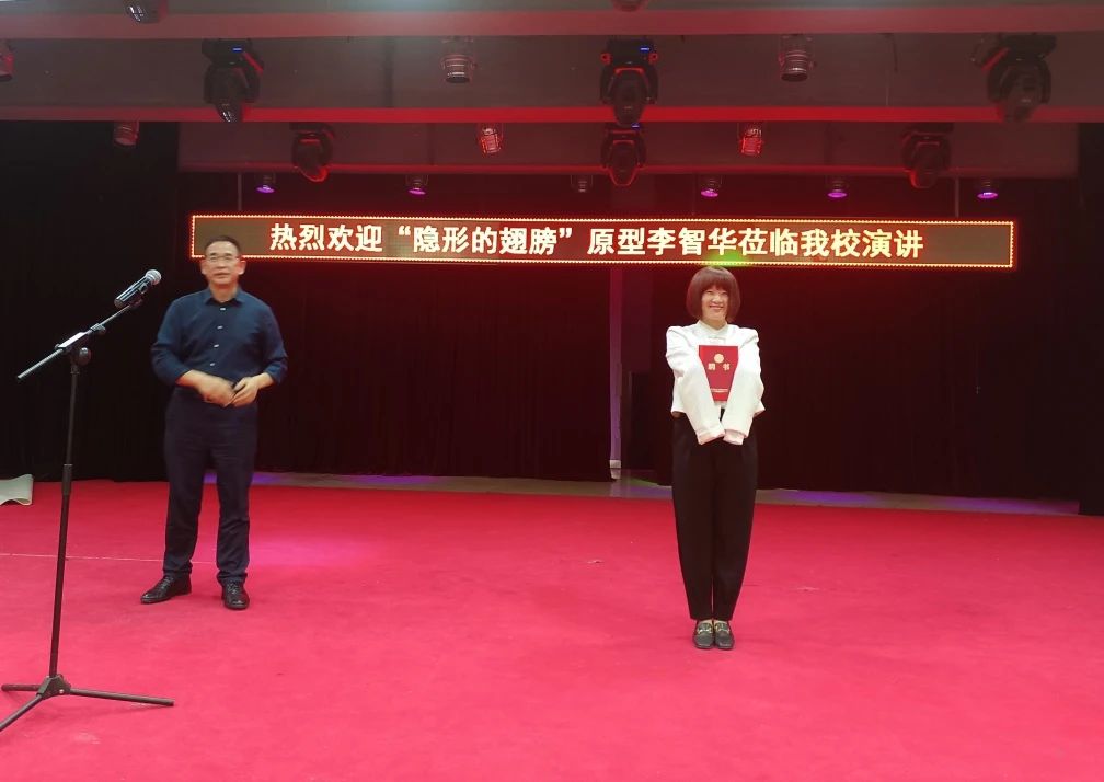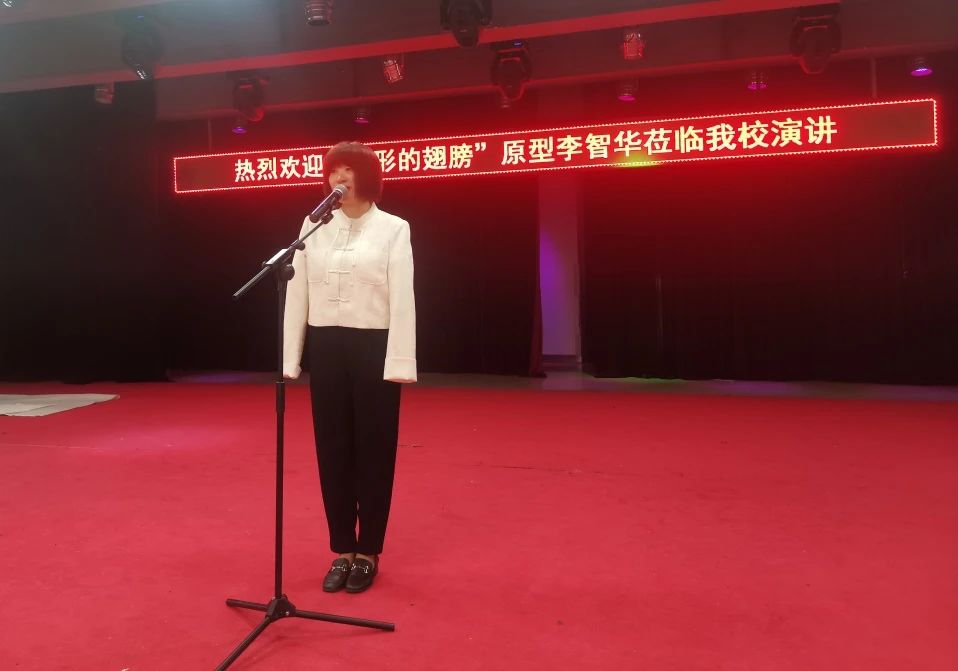 副校长罗德龙致辞。罗校长向大家隆重介绍了李智华老师:一位非常特殊的嘉宾,她是一个榜样,是一个拥有“隐形翅膀的天使”。她来自内蒙古,父亲是一位农民,母亲患有严重的精神疾病,在她很小的时候,因为一场大火,失去了双臂。她拥有双臂的时间仅有百天,左脸和头部也因火灾严重烧伤,这对任何一个人来说是何等的残酷和不幸,但她却凭借坚定的信念和顽强的意志,用她的双脚,踏出了一条辉煌的人生之路。她被中华人民共和国教育部、团中央、中国妇联、中国残联树为“全国中小学生学习的典范”,荣获华表奖的影片——《隐形的翅膀》,演的就是她的故事。她多次站在讲台与青少年分享,她以震撼人心的力量激励了千千万万的人……