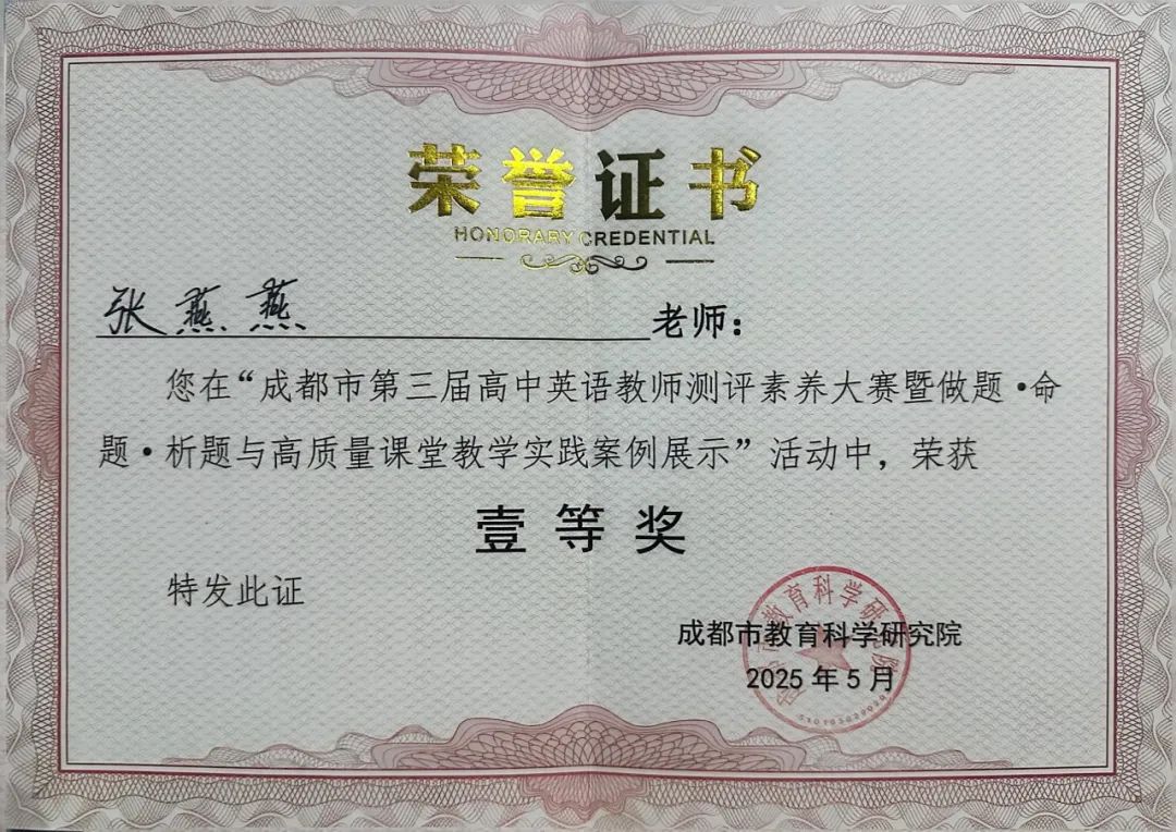 风华正茂展风采,笔落惊风妙笔扬。我校张燕燕老师在成都市第三届高中英语测评素养大赛金牛区选拔赛中脱颖而出,荣获一等奖!她凭借扎实的综合素养,代表金牛区出战成都市决赛,最终斩获一等奖。这是她个人的荣耀,更是我校教学成果的有力彰显。