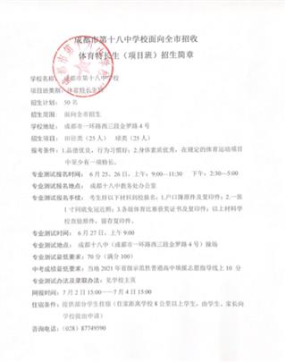 成都市第十八中学校2021年高中艺体特长生招生资格审查安排及专业测试办法