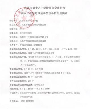 2018-06-112018年成都市部分普通高中校园足球高水平运动员预备班招生计划报考须知一、经四川省教育厅、成都市教育局批准,成都市成都七中(高新校区)、成都十八中、成都列五中学面向全市招收校园足球高水平运动员预备班(以下简称校园足球班)。二、具有成都市(22个区(市)县)户籍的2018年应届初三毕业生均可报考。每位学生限...阅读 - 11 2018.06